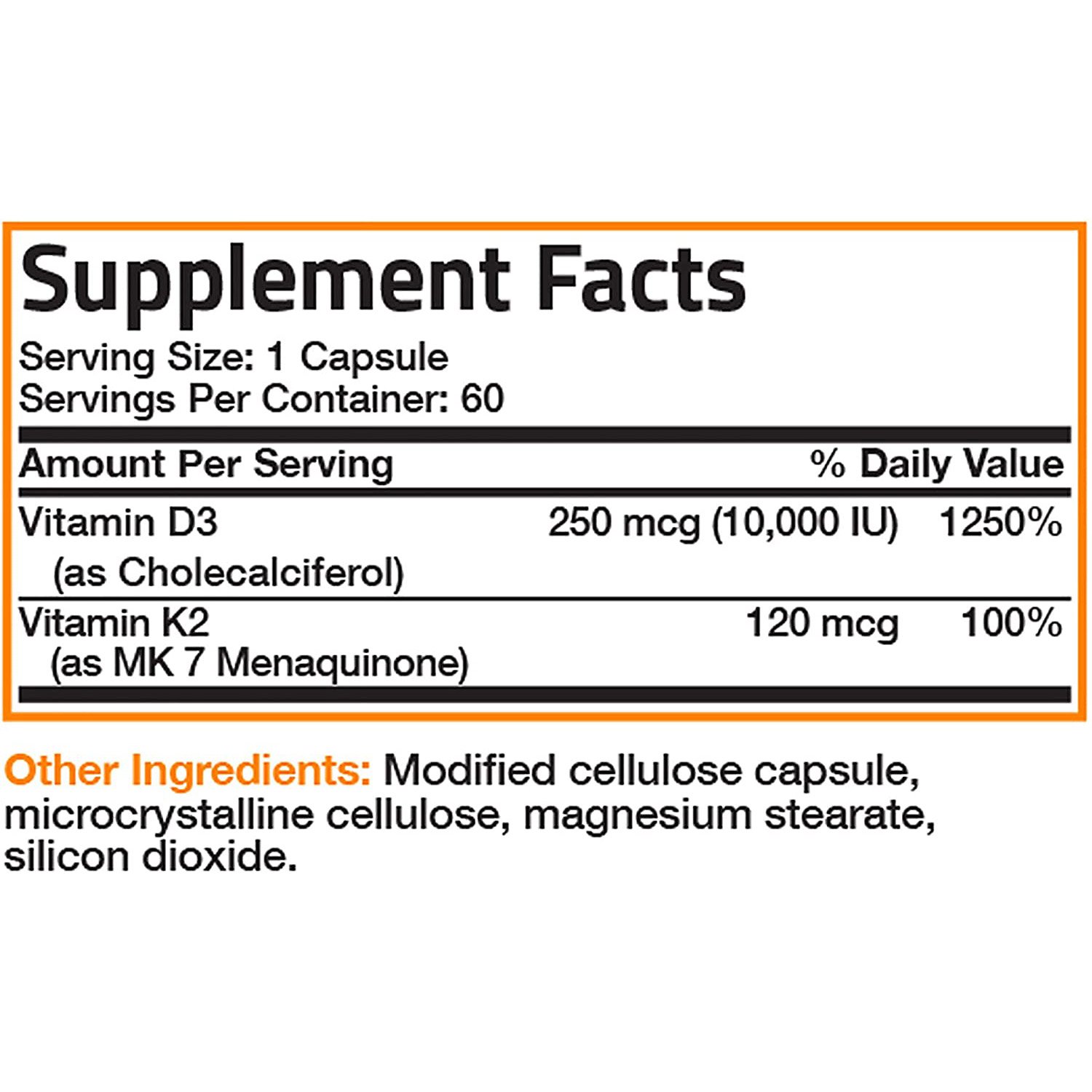 - Высококачественная формула повышенной прочности: содержит 10 000 МЕ витамина D3 плюс 120 мкг витамина K2 в виде MK-7 для превосходной поддержки костей, сердца и иммунитета. Объект в Нью-Йорке.