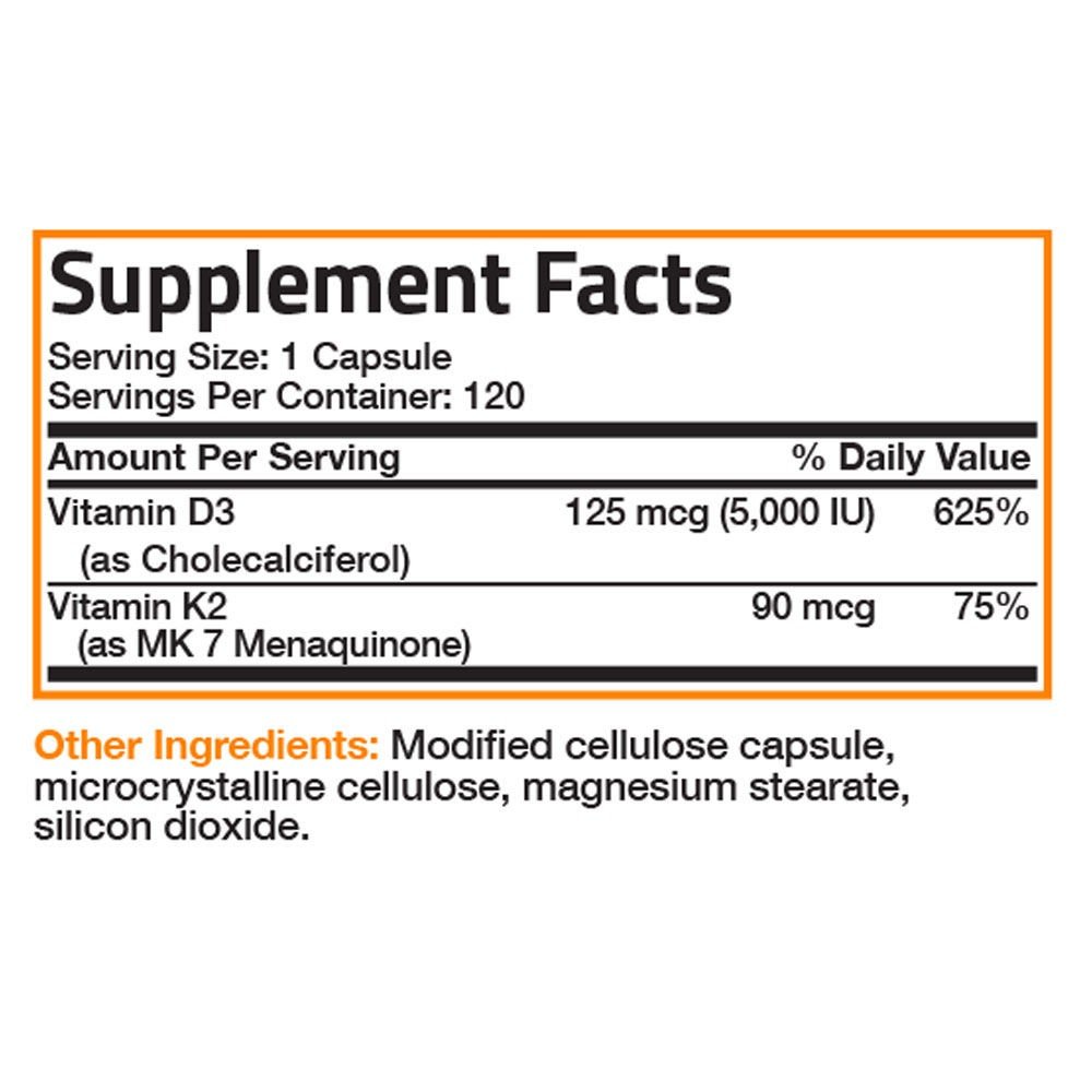 Витамин K2 (MK7) с добавкой D3 для здоровья костей и сердца Формула без ГМО 5000 МЕ витамина D3 и 90 мкг витамина K2 MK-7, 120 капсул