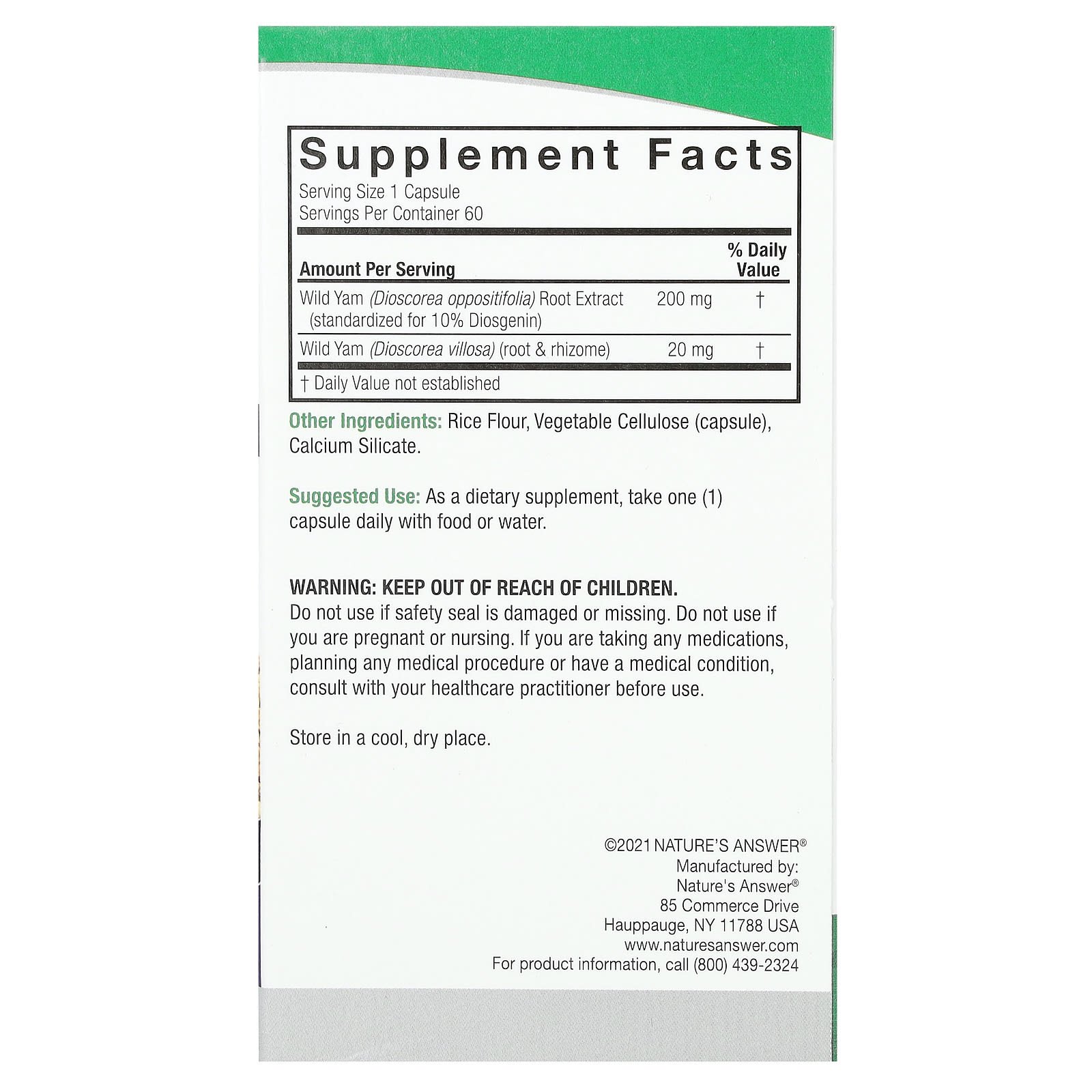 Nature’s Answer, дикий ямс, 220 мг, 60 вегетарианских капсул